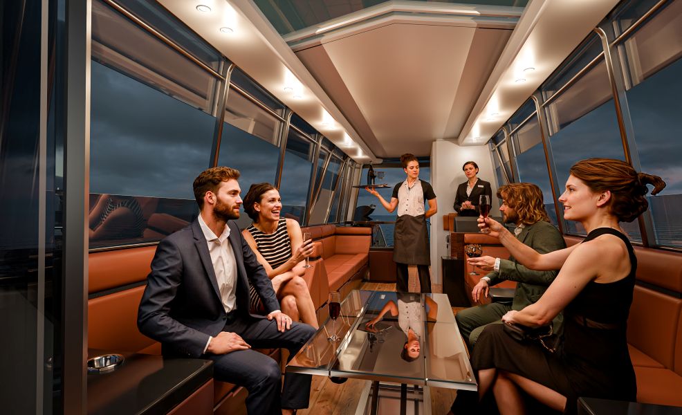 Chất liệu hoàn thiện chủ yếu là nhôm và kính cùng thiết kế hiện đại mang lại trải nghiệm thú vị cho người sử dụng dịch vụ.