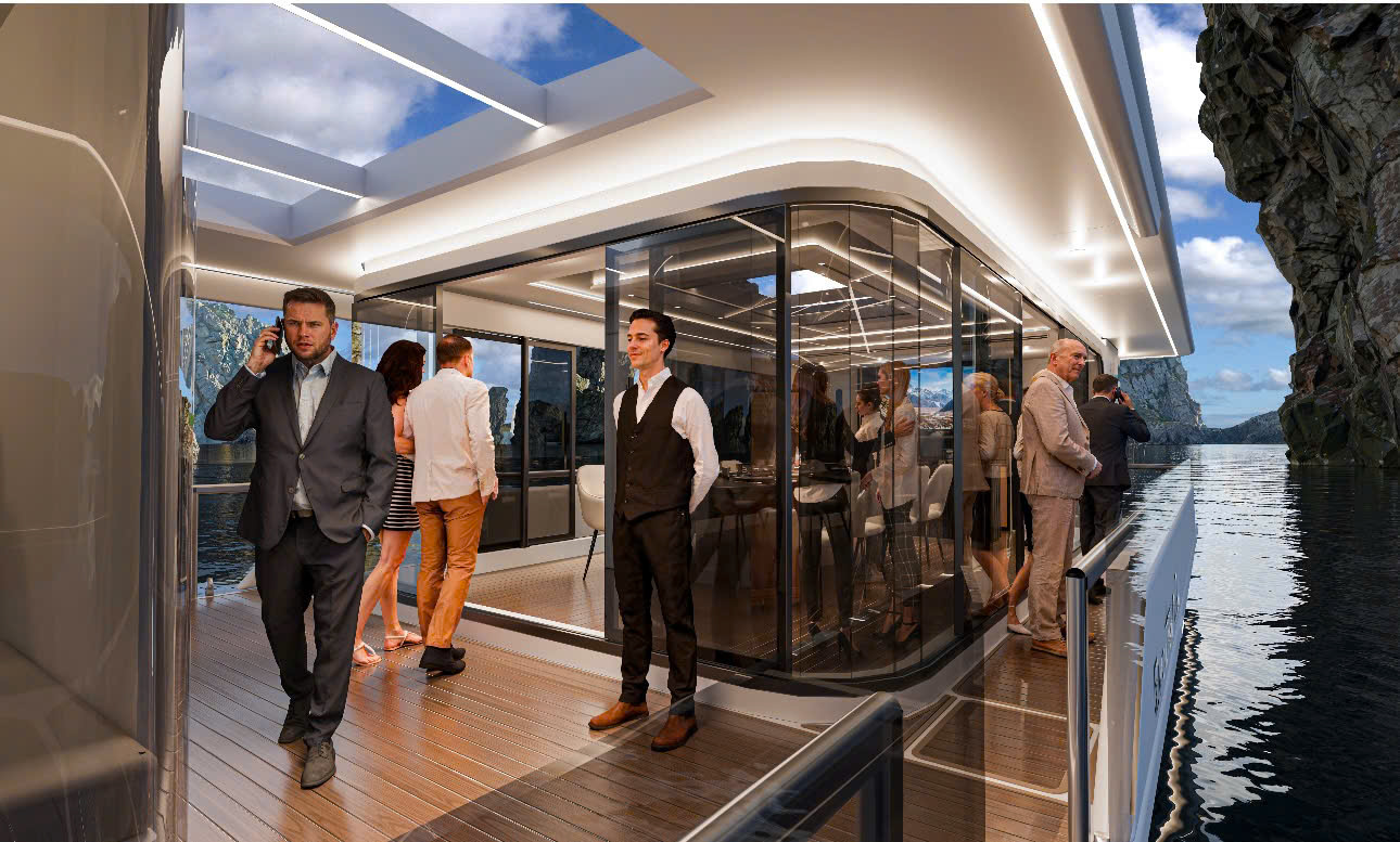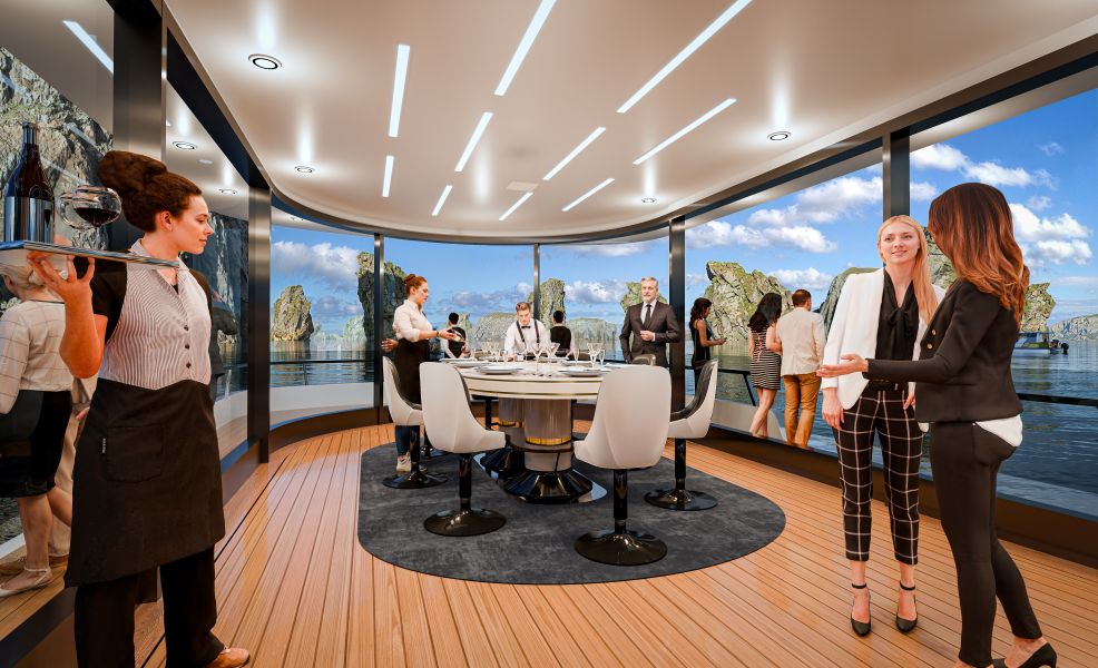 Với thiết kế sang trọng, lịch sự, không gian giải trí và ăn uống trên tàu cũng được tính toán tối ưu cho trải nghiệm người dùng, buồng lái ở tầng trên cách biệt với không gian hành khách, đề cao tính riêng tư và đưa đến trải nghiệm trọn vẹn của du khách.
