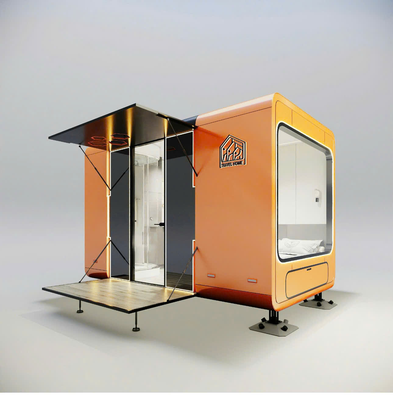 Mẫu nhà lắp ghép du lịch nhỏ gọn, hiện đại với thiết kế hình hộp bo tròn các góc, có màu cam nổi bật. Một mặt của ngôi nhà có thể mở ra tạo thành một không gian mở với sàn gỗ, để lộ bên trong là khu vực ngủ nghỉ đơn giản, có giường. Ngôi nhà được đặt trên các chân đế nhỏ, gợi ý khả năng di chuyển và lắp đặt dễ dàng ở nhiều địa điểm khác nhau.